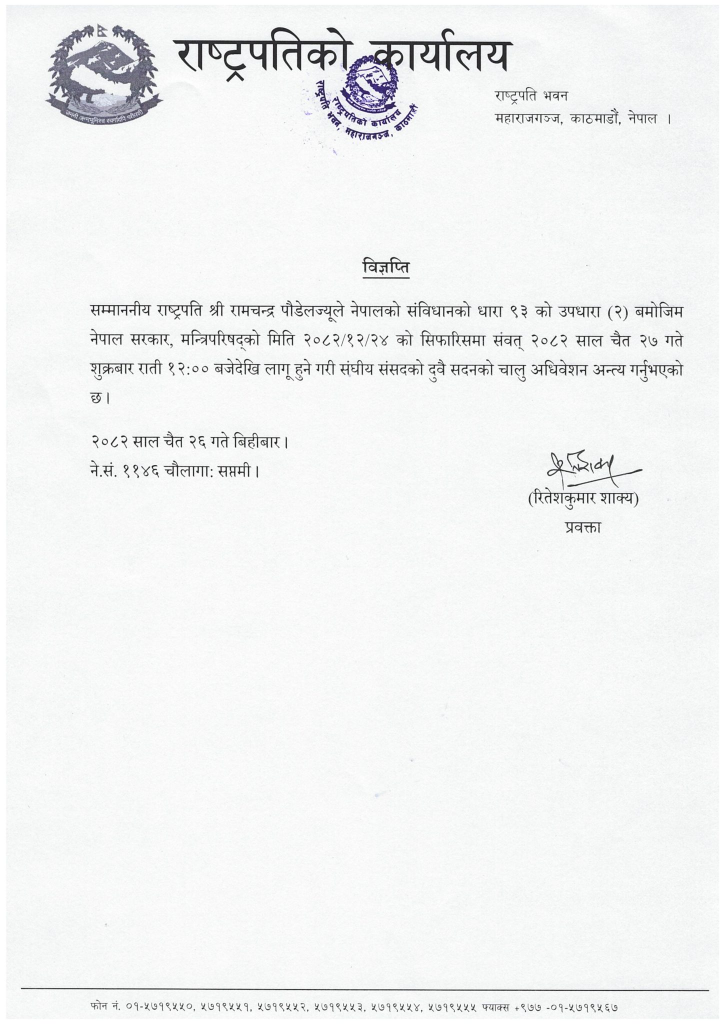 मन्त्रिपरिषद्को सिफारिस बमोजिम राष्ट्रपति पौडेलले चैत २७ गते शुक्रबार राति १२ बजेदेखि लागू हुनेगरी दुवै सदनको अधिवेशन अन्त्य गरेका हुन्।